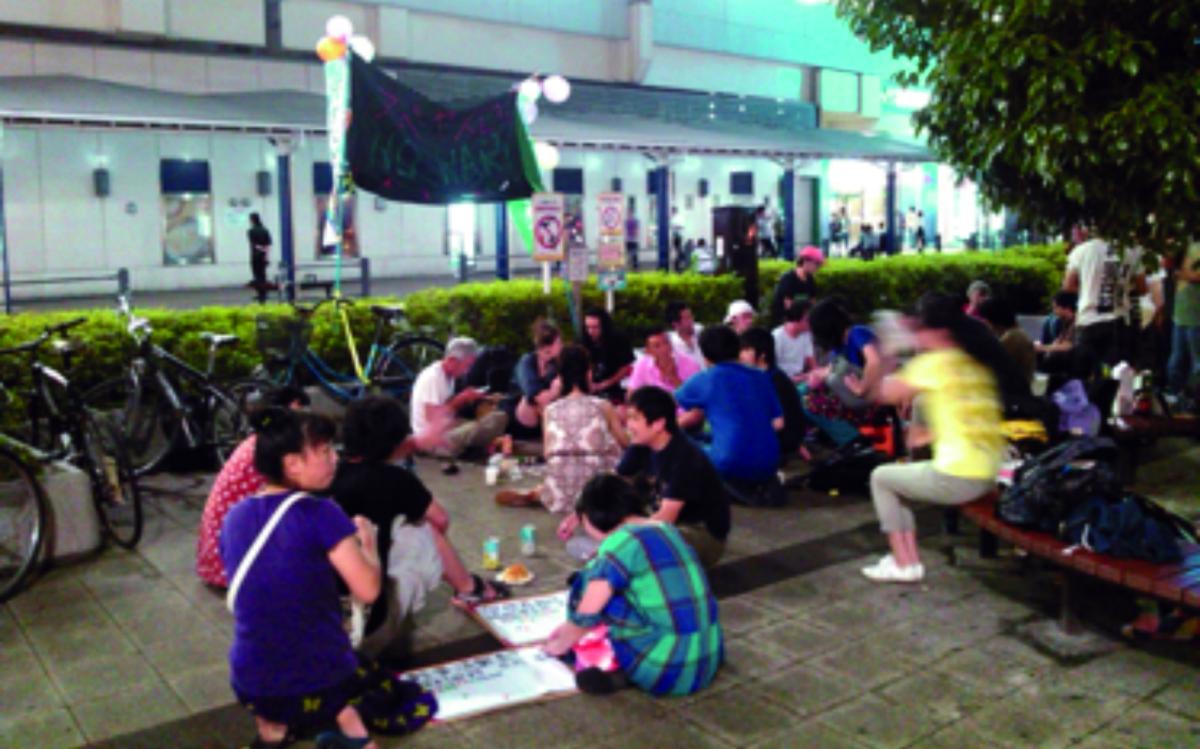 Dame ren durante un banchetto pacifista improvvisato davanti alla stazione di Kōenji