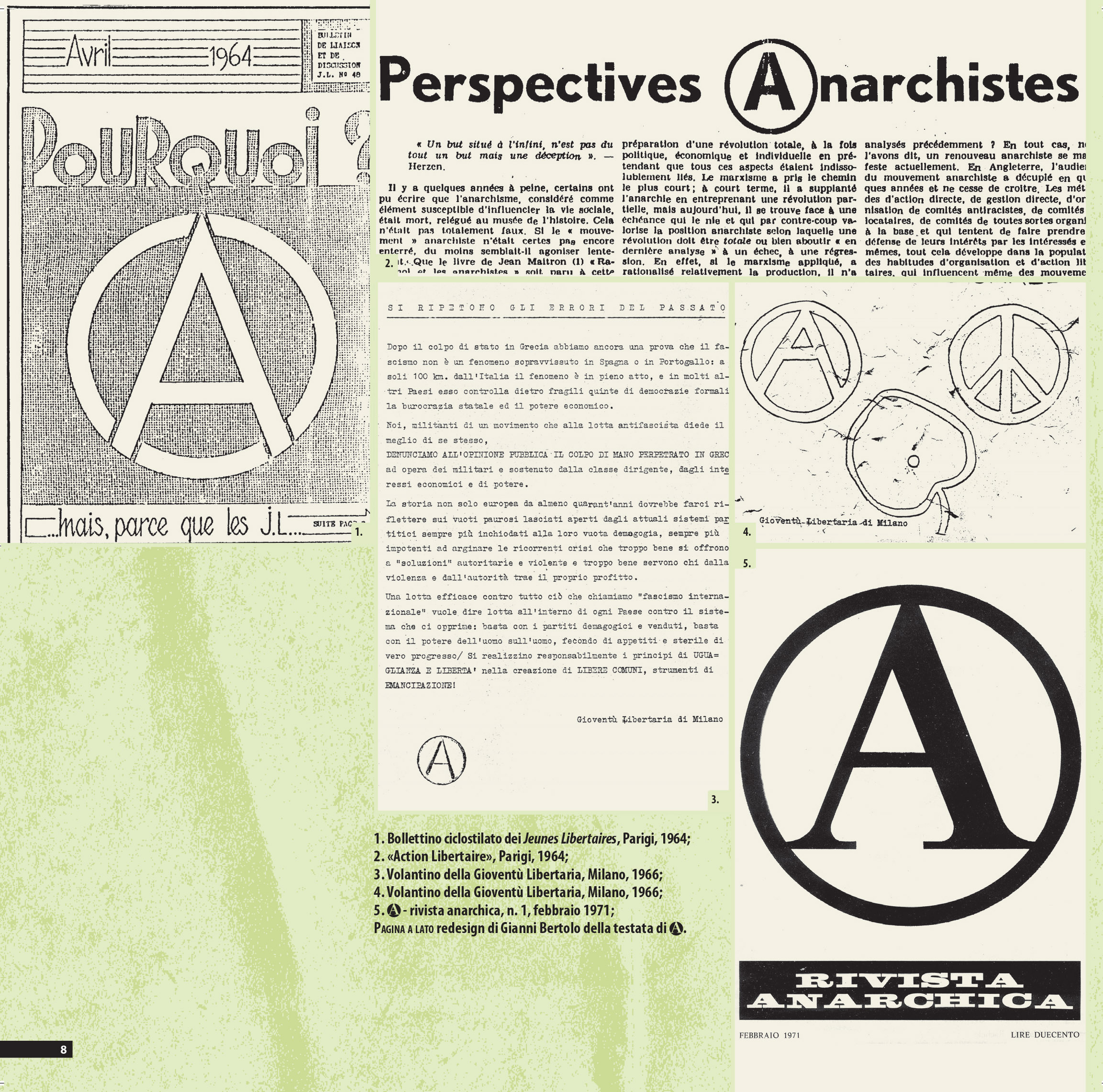 • 1. Bollettino ciclostilato dei Jeunes Libertaires, Parigi, 1964; 2. ‘Action Libertaire’, Parigi, 1964; 3. Volantino della Gioventù Libertaria, Milano, 1966; 4. Volantino della Gioventù Libertaria, Milano, 1966; 5. ‘A rivista anarchica’, n. 1, febbraio 1971. Fonte: Archivio G. Pinelli, Milano